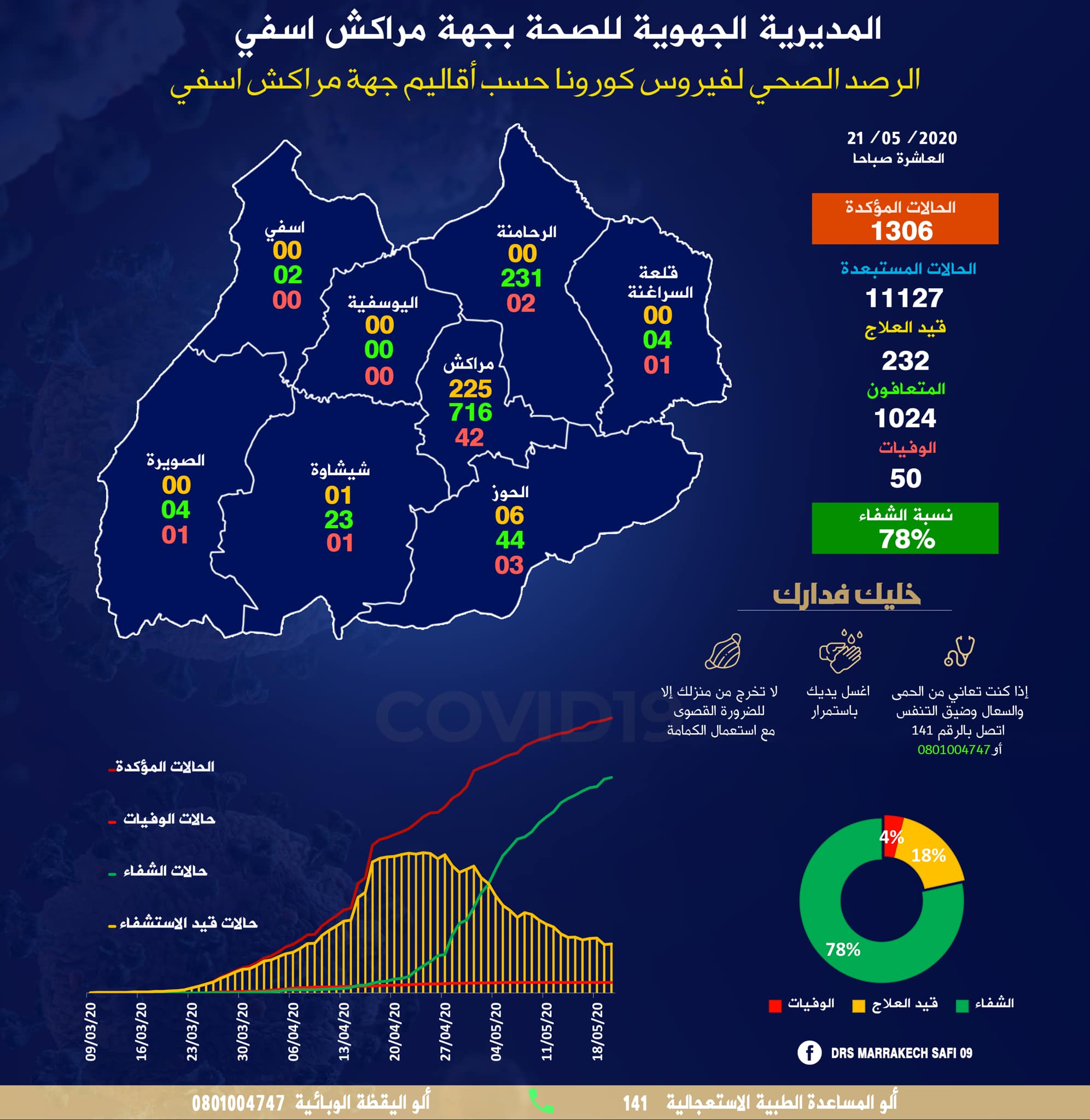 بلغ عدد الحالات المؤكدة بفيروس كورونا بجهة مراكش أسفي، ما مجموعه 1306 حالات، إلى غاية صباح الخميس 21 ماي على الساعة العاشرة، فيما توجد 232 حالة قيد العلاج، وتم تسجيل 1024 متعاف، و50 وفاة منذ بداية الجائحة.