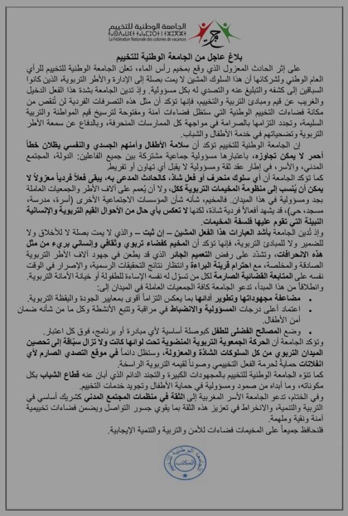 وجاء في نص البلاغ “على إثر الحادث المعزول الذي وقع بمخيم رأس الماء، تعلن الجامعة الوطنية للتخييم للرأي العام الوطني ولشركائها أن هذا السلوك المشين لا يمت بصلة إلى الإدارة والأطر التربوية، الذين كانوا السباقين إلى كشفه والتبليغ عنه والتصدي له بكل مسؤولية. وإذ تدين الجامعة بشدة هذا الفعل الدخيل والغريب عن قيم ومبادئ التربية والتخييم، فإنها تؤكد أن مثل هذه التصرفات الفردية لن تُنقص من مكانة فضاءات التخييم الوطنية التي ستظل فضاءات آمنة ومفتوحة لترسيخ قيم المواطنة والتربية السليمة، وتجدد التزامها بالصرامة في مواجهة كل الممارسات المنحرفة، وبالدفاع عن سمعة الأطر التربوية وتضحياتهم في خدمة الأطفال والشباب.