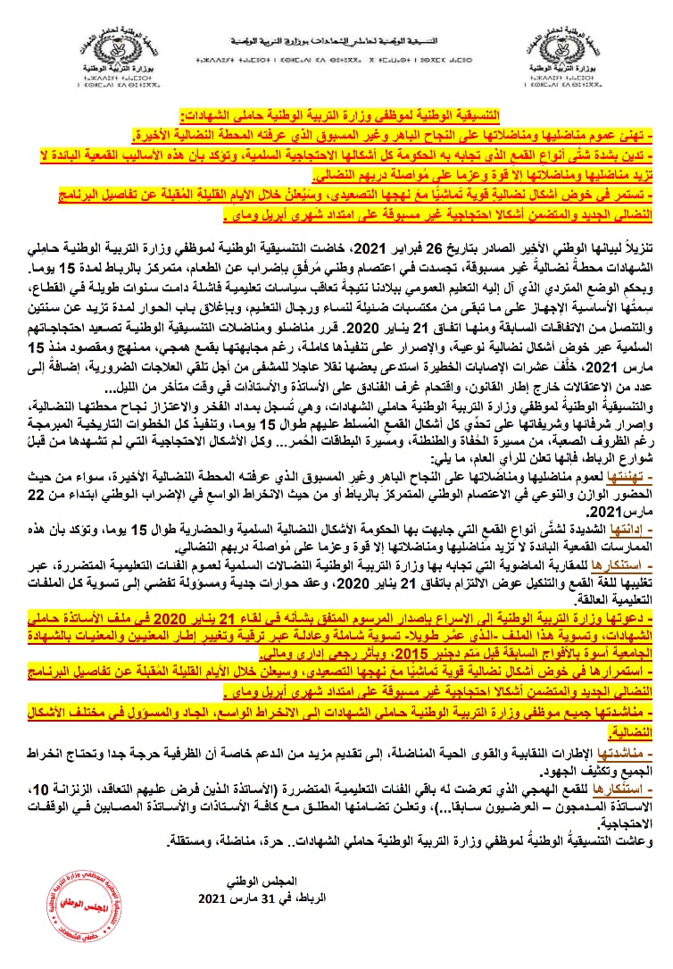 أعلنت التنسيقية الوطنية لموظفي وزارة التربية الوطنية حاملي الشهادات، “استمرارها في خوض أشكال نضالية قوية تَماشِيًّا معَ نهجها التصعيدي”. وأنها ستعلن “خلال الأيام القليلة المُقبلة عن تفاصيلِ البرنامج النضالي الجديد والمتضمن أشكالا احتجاجية غير مسبوقة على امتداد شهري أبريل وماي”.