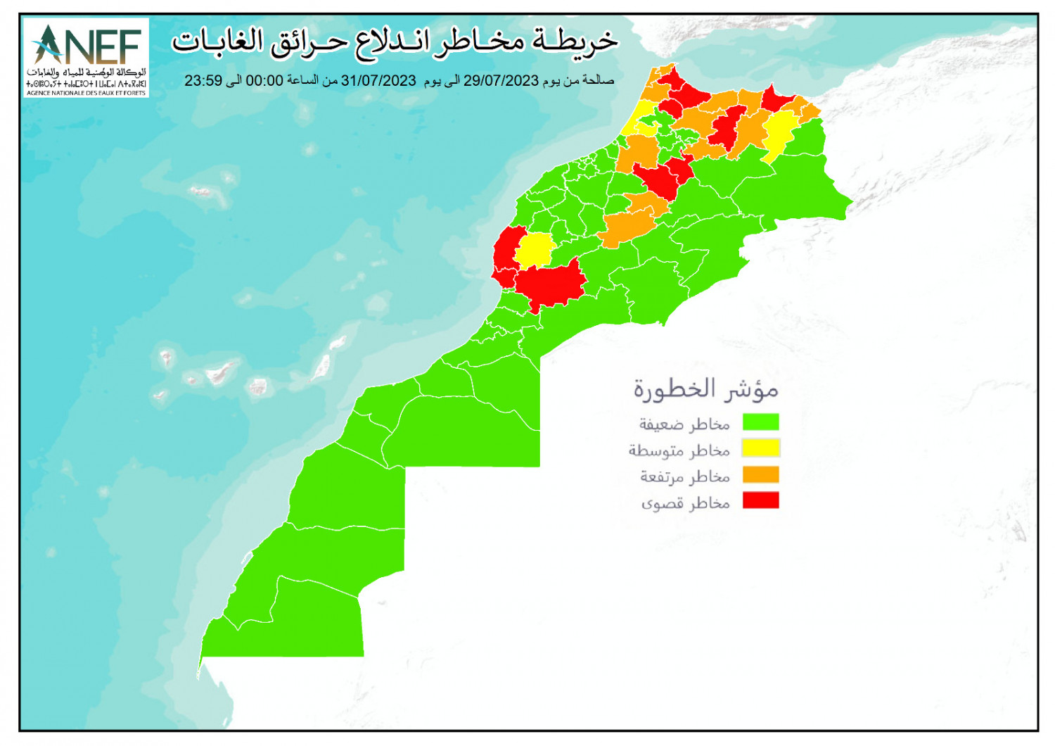 أصدرت الوكالة الوطنية للمياه والغابات، خرائط تنبؤ تحدد بدقة المناطق الحساسة والمعرضة لخطر اندلاع الحرائق الغابوية، ابتداء من يوم 29 يوليوز وإلى غاية يوم 31 يوليوز.