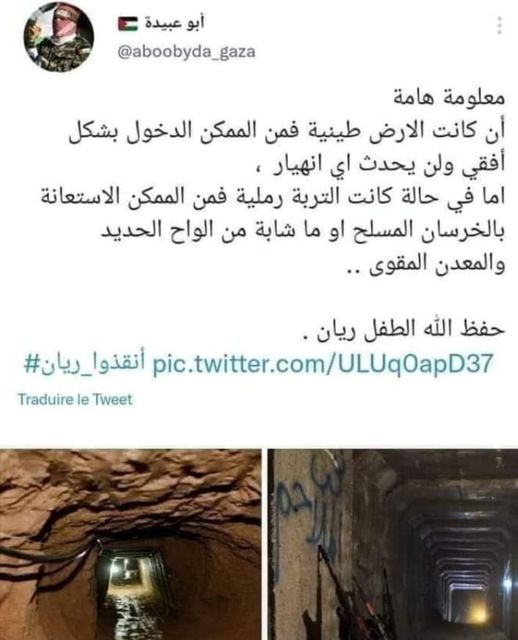 قال الناطق الرسمي باسم حركة المقاومة الإسلامية حماس، أبو عبيدة، والمعروف بالملثم، بخصوص محنة الطفل ريان، الذي سقط في بئر بدوار اغرم، بجماعة تمروت بإقليم شفشاون،ـ ومزال يقبع فيه منذ فاتح فبراير 2022، وذلك بعد أن خرج بتدوينة يتحدث فيها عن تجربته وحركة حماس في بناية الأنفاق.