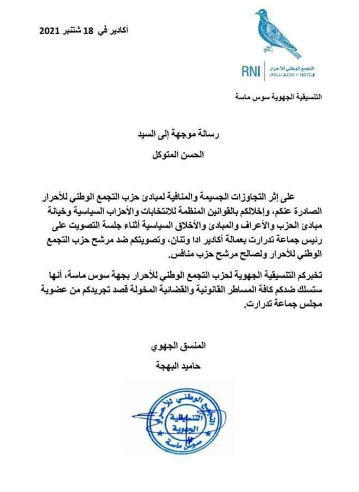 وحسب وثيقة يتوفر موقع هوية بريس على نسخة منها فإن حزب أخنوش سيجرد رئيس الجماعة المذكور، بسبب قامه بالتصويت ضد مرشح حزبه (التجمع الوطني للأحرار) ولصالح مرشح حزب آخر منافس، أثناء جلسة التصويت على رئيس جماعة تدرارت بعمالة أكادير إدا وتنان.