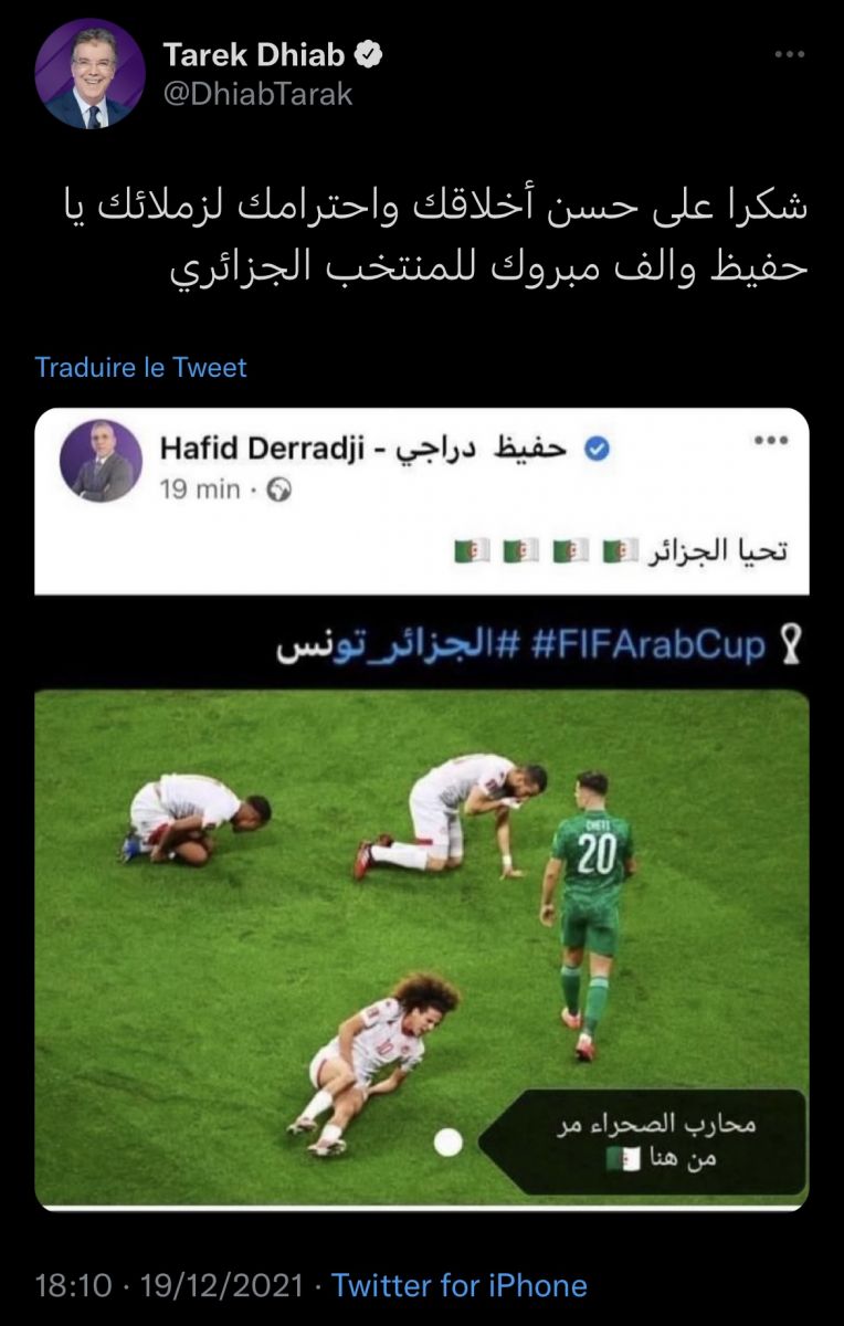 رد طارق ذياب وزير الشباب والرياضة في تونس بحكومة حمادي الجبالي، وحكومة علي العريض واللاعب السابق للمنتخب التونسي، ومحلل قنوات بي إن سبورتس، على تدوينة للإعلامي والمعلق الرياضي الجزائري حفيظ درّاجي، بعد تتويج الجزائر بنهائي كأس العرب على حساب تونس.