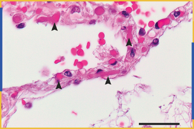 لكن في حالة وفيات “كوفيد-19” فقط كانت هناك آثار ضرر بالغ بالبطانة الخلوية التي تغطي الأوعية الدموية من الداخل (endothelium)، مع كميات كبيرة من الفيروس في خلايا تلك الطبقات، وعدد كبير من الجلطات في الأوعية الدموية، في حديثها مع “ميدان” تقول نيجري: “تأثُّر تلك الخلايا التي تغطي الأوعية من الداخل هو ما يتسبّب في تحفيز تخثر الدم، كذلك فإن الاستجابة الالتهابية الشديدة بسبب المرض تُحفِّز التخثر، يبدأ الأمر في الأوعية الدموية المحيطة بالرئة ثم ينطلق إلى أعضاء الجسم كافة”.
