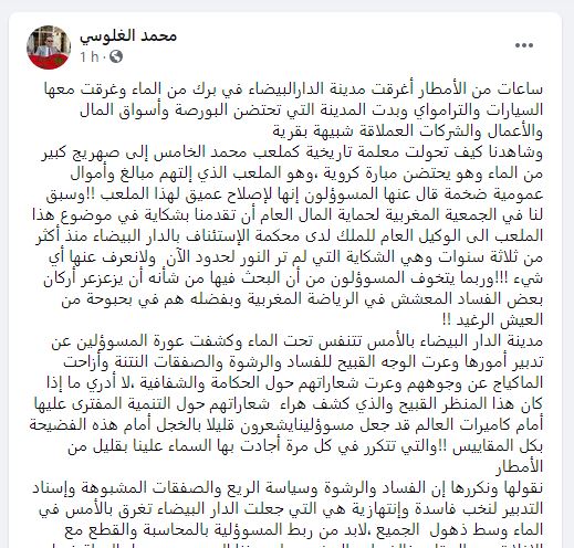وأضاف الغلوسي، في تدوينة له، أن “ساعات من الأمطار أغرقت مدينة الدارالبيضاء في برك من الماء وغرقت معها السيارات والترامواي وبدت المدينة التي تحتضن البورصة وأسواق المال والأعمال والشركات العملاقة شبيهة بقرية”.
