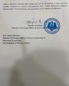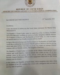 وأضافت الوزارة في رسالة خاصة لوزير الخارجية المغربي “يشرفني أن أبلغكم بأن جنوب السودان يثني على جلالة الملك محمد السادس. تؤكد عزمها على زيادة تعزيز العلاقات بين البلدين”. مردفة “المملكة المغربية وجمهورية جنوب السودان بما يحقق المصلحة المشتركة لبلدينا الصديقين وشعبينا”.