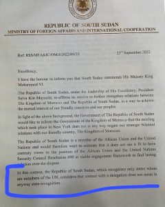 وزاد المصدر ذاته “تود حكومة جمهورية جنوب السودان إبلاغ حكومة المملكة المغربية بأن الاجتماع الذي عقد في نيويورك لا ينفي بأي حال من الأحوال علاقاتنا الثنائية الاستراتيجية مع بلدنا الصديق”.