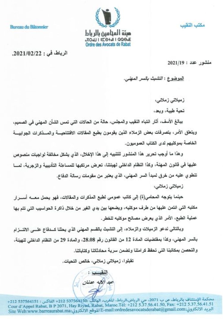 خرق “السر المهني” يخلق الجدل بين المحامين بهيئة الرباط وتدخل النقيب.. (وثيقة)