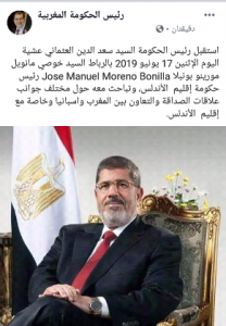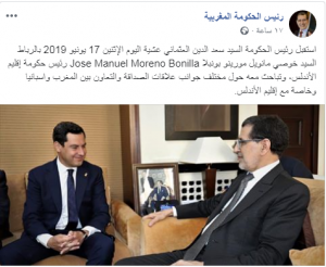 نشرت الصفحة الرسمية، لرئيس الحكومة، سعد الدين العثماني، خبرا جاء فيه: “استقبل رئيس الحكومة السيد سعد الدين العثماني عشية اليوم الإثنين 17 يونيو 2019 بالرباط السيد خوصي مانويل مورينو بونبلا Jose Manuel Moreno Bonilla رئيس حكومة إقليم الأندلس”.
