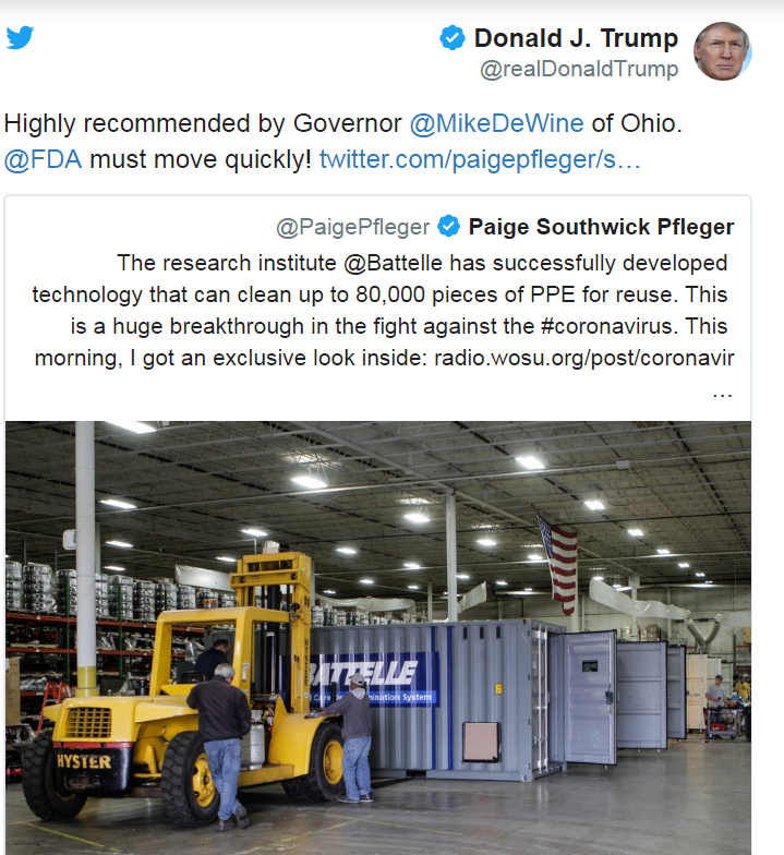 ونشر ترامب تغريدة طالب فيها هيئة الغذاء والدواء الأمريكية بالمصادقة على معدات طبية اقترحها عمدة ولاية أوهايو، وبدلا من أن يذكر الهيئة في تغريدته ذكر حساب مجهول يحمل صورة «سنابر» سعودي مشهور.
