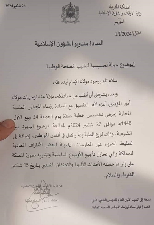 يذكر أن مسوِّد هذه الوثيقة المفبركة أخطأ في التاريخ الهجري ليوم الجمعة 27 شتنبر 2024، والذي سيوافق في المغرب 23 ربيع الأول 1446هـ.