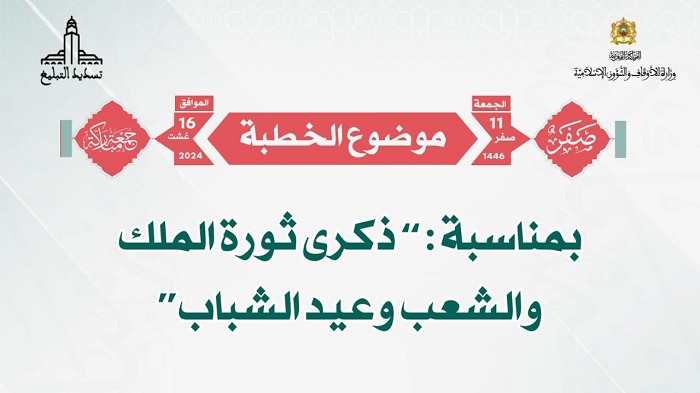 أعلنت وزارة الأوقاف والشؤون الإسلامية عبر موقعها الإلكتروني أن موضوع خطبة بعد غد الجمعة، سيكون في موضوع “ذكرى ثورة الملك والشعب وعيد الشباب“.