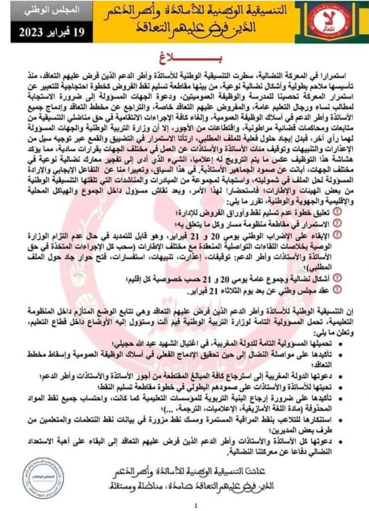 وأضافت التنسيقية في نفس البلاغ على أن الأساتذة ورغم تعليق خطوة عدم تسليم نقط وأوراق الفروض للإدارة،