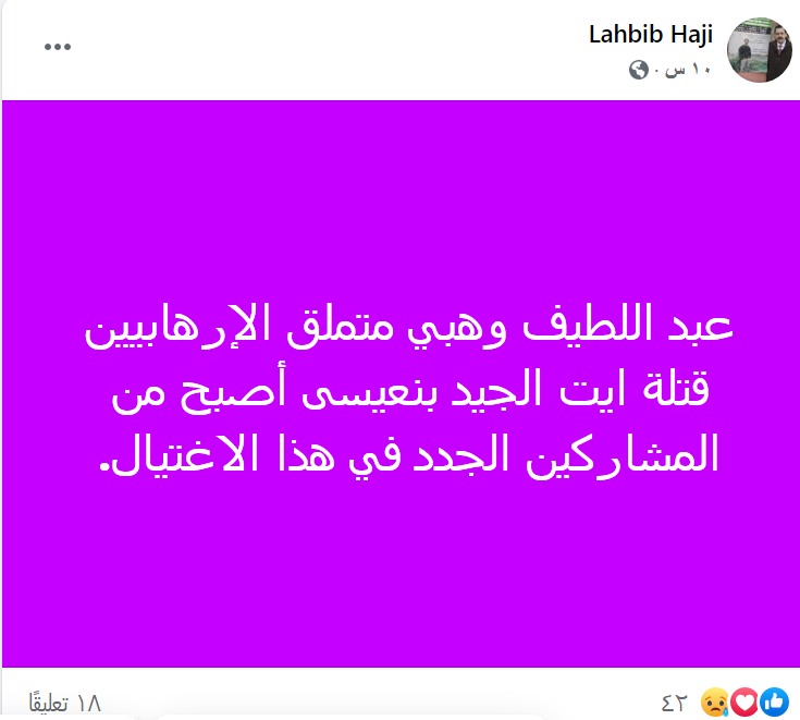 وكتب “حجي” في تدوينة له على صفحته بالفيسبوك “عبد اللطيف وهبي متملق الإرهابيين قتلة ايت الجيد بنعيسى أصبح من المشاركين الجدد في هذا الاغتيال”.