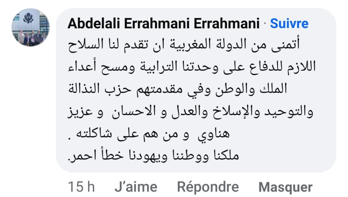 وورد في بلاغ المرصد “غداة توجيهه رسالة رقمية إرهابية عبر تعليق إجرامي بصفحة مغاربة ضد التطبيع الصهيوني، الحساب الرسمي للمرصد المغربي لمناهضة التطبيع، بحق الكاتب العام للمرصد المغربي لمناهضة التطبيع عزيز هناوي.. المدعو عبد العلي الرحماني رئيس ما يسمى جمعية موسى بن ميمون للثقافة اليهودية بالناظور.. ينشر صورا التقطت له خلال حضوره “ضيفا مكرما” على مهرجان دبدو للموسيقى الشعبية قبل ايام قليلة…بين أحضان ضباط الدرك الملكي والقوات المساعدة (‼️‼️) .. كإشارة منه ورسالة غير مشفرة إلى أنه “محمي” من القانون المغربي الذي ينص بكل وضوح على تجريم التهديد بالقتل عبر الوسائل الالكترونيه..”.