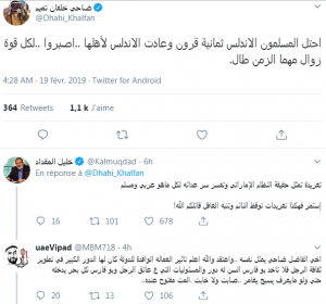 وقال خلفان، قائد شرطة دبي السابق، في تغريدته: “احتل المسلمون الأندلس ثمانية قرون وعادت الأندلس لأهلها.. اصبروا.. لكل قوةٍ زوالٌ مهما الزمن طال”.