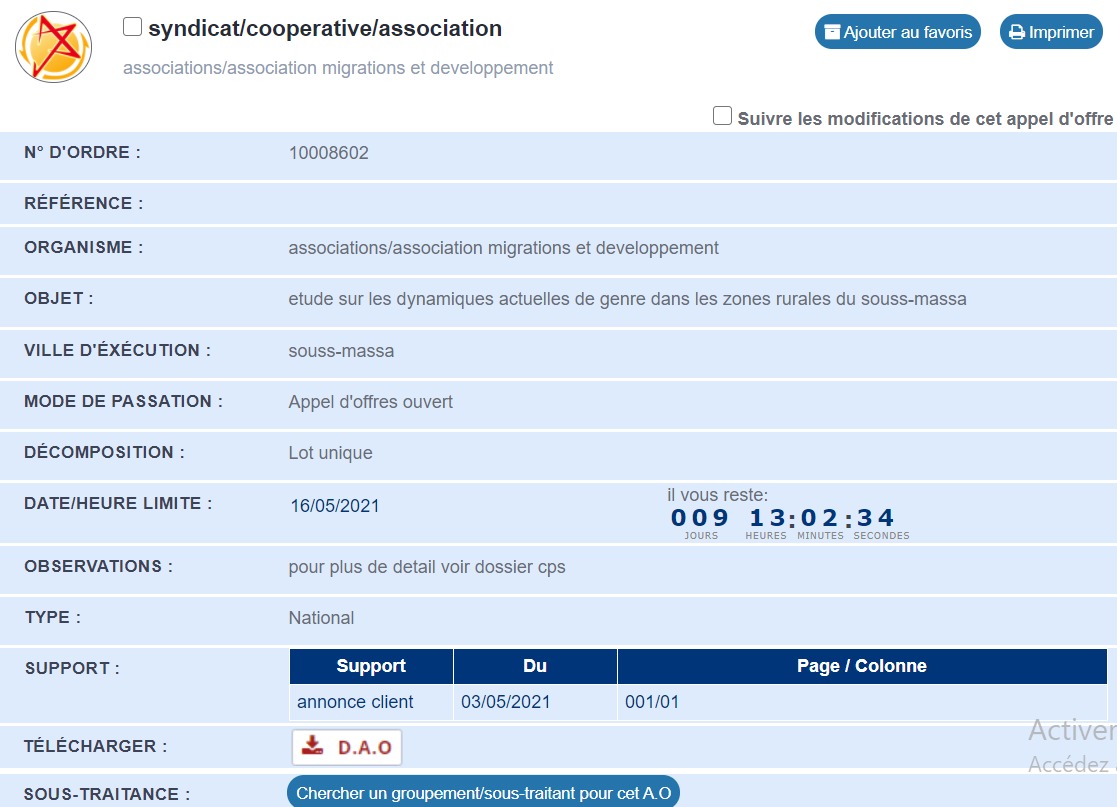 ويظهر مثال على هذه الصفقات المنشورة على موقع متخصص في إشهار إعلانات هذه الصفقات التي تستهدف جمعيات المجتمع المدني، بأموال طائلة. طريقة البحث والعمل، إذ عين موضوع الصفقة في دراسة لحياة النساء بالمجتمع المغربي بجهة سوس ماسة.