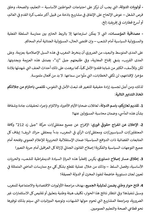 ومن التدابير التي طالب بها الموقعون، فتح حوار وطني يضمن تمثيلية الجميع بهدف مراجعة الأولويات الاقتصادية والاجتماعية للمغرب، وسبل تنفيذها.