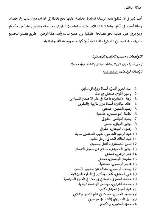 وهذا نص الرسالة كاملا، وأسماء الشخصيات الموقعة عليه: