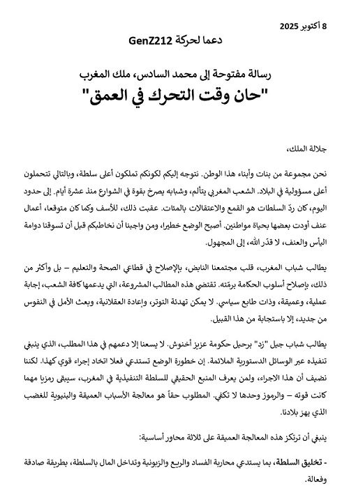 وجه مجموعة من السياسيين والحقوقيين والاعلاميين والأكاديميين، رسالة مفتوحة، رفعوها إلى الملك محمد السادس حول مطالب “شباب جيل زد”، بعنوان: “حان وقت التحرك في العمق“.