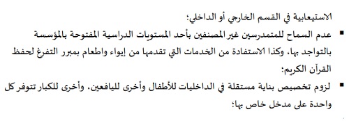 ومن الشروط التعجيزية يضيف المشرف “من الشروط التي يصعب على كثير من المدارس الالتزام بها “لزوم تخصص بناية مستقلة في الداخليات للأطفال وأخرى لليافعين وأخرى للكبار، تتوفر كل واحدة على مدخل خاص بها”، وهذا إشكال كبير.