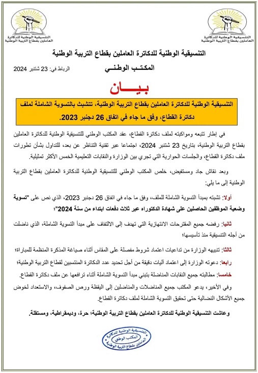 وختم البيان، بـ”عاشت التنسيقية الوطنية للدكاترة العاملين بقطاع التربية الوطنية؛ حرة، وديمقراطية، ومستقلة”.