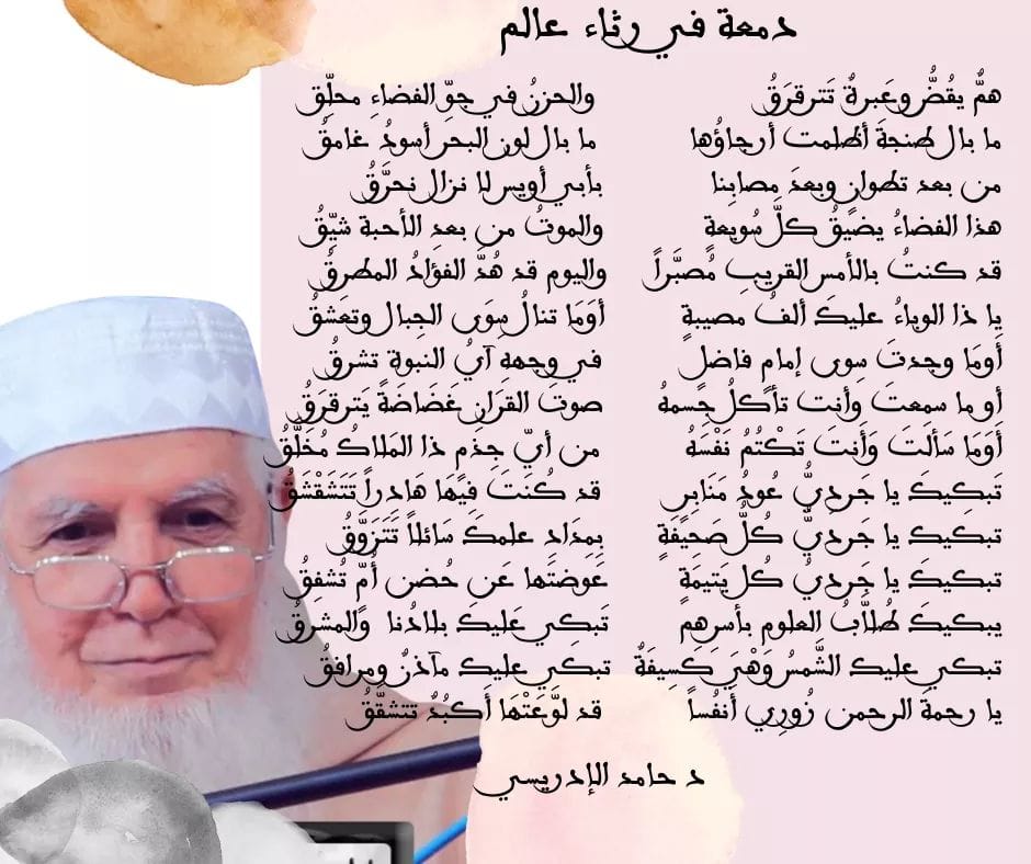 وقد كتب الدكتور حامد الادريسي قصيدة يرثي فيها الشيخ المرحوم، بعنوان “دمعة في رثاء عالم”.