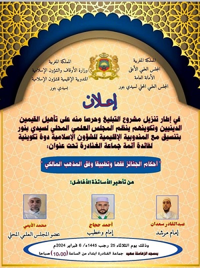 سيؤطر الدورة كل من الإمام المرشد عبد القادر سعدان، والإمام الخطيب أحمد حجاج وعضو المجلس العلمي المحلي محمد الأيمي.