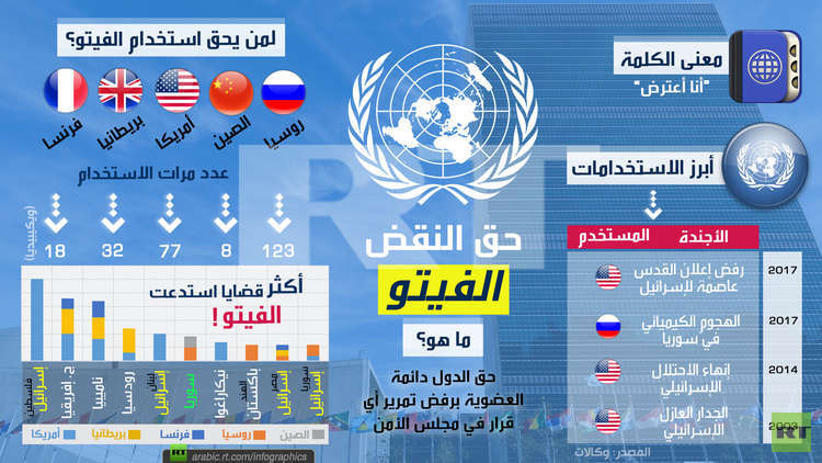 ويضم المجلس 5 أعضاء دائمين يتمتعون بحق النقض الفيتو هم روسيا، والصين والولايات المتحدة وبريطانيا وفرنسا.