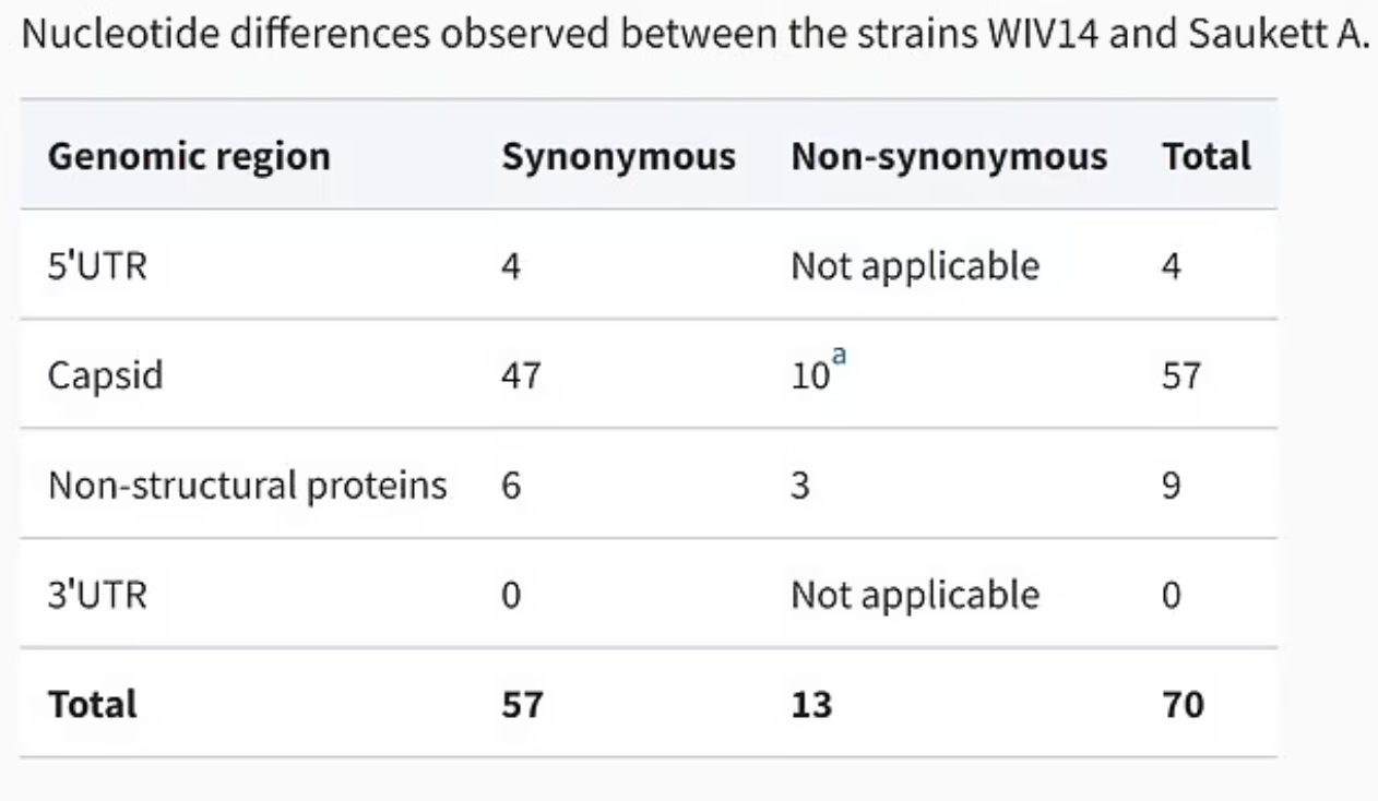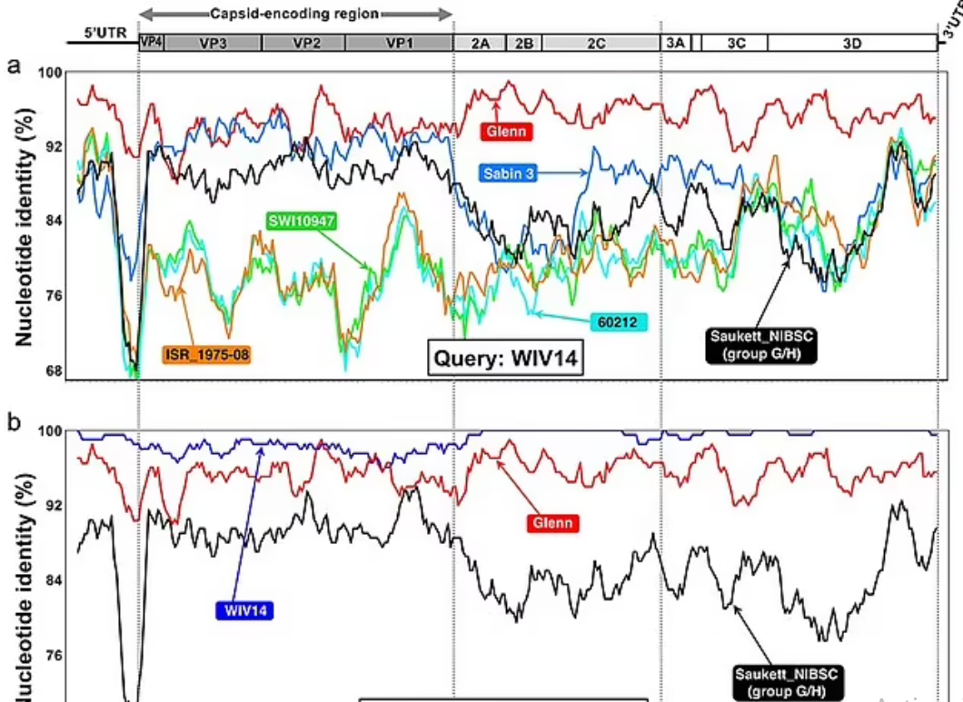 وقد وجدوا 70 نيوكليوتيدا فقط من الاختلاف بين السلالات، عبر الجينومات التي تحتوي على أكثر من 7 آلاف من اللبنات الأساسية للحمض النووي، حيث قالوا: “نظرا لأن فيروس Saukett A وفيروس WIV14 يشتركان في أكثر من 99 بالمائة من التشابه، فمن الممكن أن تكون عدة تسريبات غير موثقة لفيروس شلل الأطفال قد حدثت في الماضي من مرافق تتعامل مع فيروسات شلل الأطفال”.