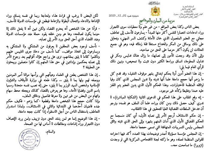 فبعد قوله تعالى: ﴿قُلْ هَلْ عِندَكُم مِّنْ عِلْمٍ فَتُخْرِجُوهُ لَنَا ۖ إِن تَتَّبِعُونَ إِلَّا الظَّنَّ وَإِنْ أَنتُمْ إِلَّا تَخْرُصُونَ﴾، كتب العضو السابق في المجلس العلمي المذكور في منشور له على فيسبوك “بعد البيانات المتكررة من إخواني في المجلس العلمي المحلي بخنيفرة -هدانا الله وإياهم للحق والصواب- وآخرها بيان اليوم الذي كتب بلغة تحريضية قصد تأليب مؤسسات الدولة علينا، وإشفاقا عليهم من الفضيحة أكثر فأكثر بعد أن أصبح الحديث عن خيانتهم لأمانة مولانا أمير المؤمنين نصره الله ملء السمع والبصر؛ فإني أدعوهم إلى مناظرة إعلامية في الموضوع”.