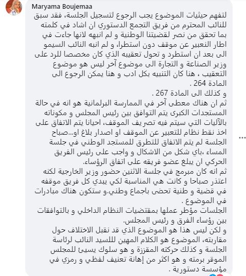 واسترسلت بوجمعة، في رد لها عن الواقعة على حسابها “بفايسبوك”، بالقول “ثم ان هناك معطى آخر في الممارسة البرلمانية هو أنه في حالة المستجدات الكبرى يتم التوافق بين رئيس المجلس و مكوناته بالآليات التي سيتم فيه تصريف الموقف، أحيانا يتم الاتفاق على أخذ نقط نظام للتعبير عن الموقف أو إصدار بلاغ أو… صباح الجلسة لم يتم الاتفاق للتطرق للمستجد الوطني في جلسة المساء ،بأي شكل من الاشكال و واجب على رئيس الفريق الحركي أن يبلغ عضو فريقه على اتفاق الرؤساء”.
