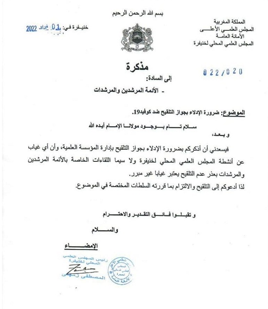 رئيس المجلس العلمي المحلي لخنيفرة يلزم الأئمة المرشدين والمرشدات بالإدلاء بجواز التلقيح (وثيقة)