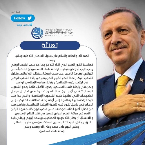 فمناسبة الفوز الكبير الذي أفاء الله عز وجل على الرئيس التركي رجب طيب أردوغان، فيطيب لرابطة علماء المسلمين أن تبعث بأسمى التهاني، لفخامة الرئيس رجب طيب أردوغان حفظه الله تعالى، وتبارك للشعب التركي هذا النصر الكبير، الذي يعبر عن إرادة الشعب التركي في ارتباطه العميق بقيمه الإسلامية وارتباطه بعالمه الإسلامي الواسع.