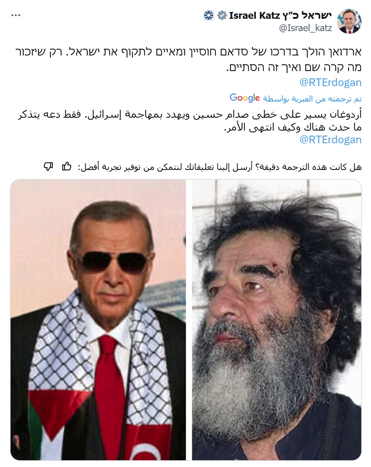 وقال وزير الخارجية الصهيوني في تدوينة على منصة “إكس” مساء الأحد: “أردوغان يسير على خطى صدام حسين ويهدد بمهاجمة إسرائيل.. فقط دعه يتذكر ما حدث هناك وكيف انتهى الأمر”.