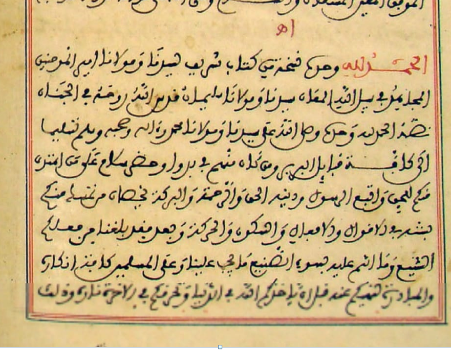 الحَمْدُ للهِ(1) وَحْدَهُ، نُسْخَةٌ مِنْ كِتَابٍ شَرِيفٍ لِسَيِّدِنَا وَمَوْلاَنَا أَمِيرِ المُؤْمِنِينَ المُجَاهِدُ فِي سَبِيلِ اللهِ المُعَانِ، سَيدنَا وَمَوْلاَنَا سُلَيْمَانُ قَدَّسَ اللهُ رُوحَهُ فِي الجِنَانِ، نَصُّهُ:
