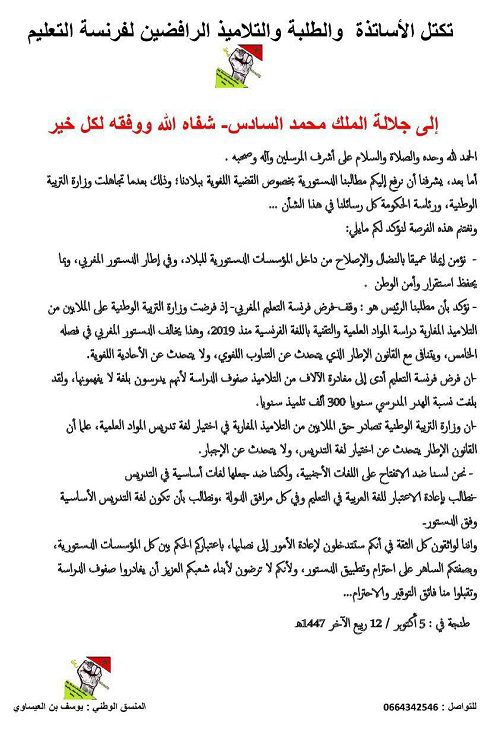 – نؤكد بأن مطلبنا الرئيس هو: وقف-فرض فرنسة التعليم المغربي- إذ فرضت وزارة التربية الوطنية على الملايين من التلاميذ المغاربة دراسة المواد العلمية والتقنية باللغة الفرنسية منذ 2019، وهذا يخالف الدستور المغربي في فصله الخامس، ويتنافى مع القانون الإطار الذي يتحدث عن التناوب اللغوي، ولا يتحدث عن الأحادية اللغوية….