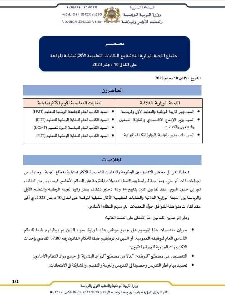 بعد اللقاء الذي جمع الحكومة ممثلة باللجنة الوزارية المكلفة لمتابعة أزمة التعليم، بالنقابات التعليمية الأربع الأكثر تمثيلية،