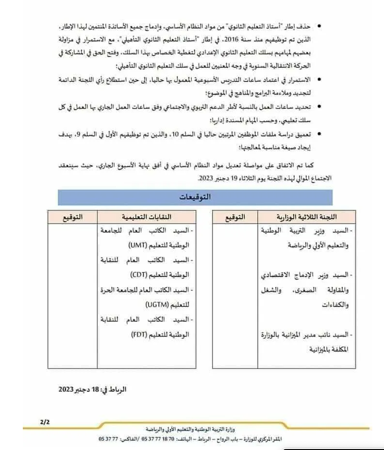 أما النقطة الثانية، تهم ساعات العمل، فيما النقطة الثالثة المتعلقة بالثانوي التأهيلي والخاص بالأساتذة المتعاقدين