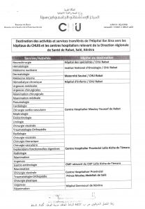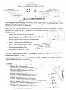 وأعلنت إدارة مستشفى ابن سينا بالرباط عن نقل جميع خدماتها استعدادًا لهدم المستشفى وإعادة بنائه. سيتم توزيع الخدمات على مراكز استشفائية أخرى بالمنطقة.