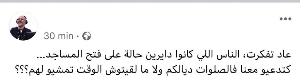 حاجة سابعة: الله يخرج بلادنا من هاذ الوباء سالمة .. والله يعفينا جميعاً .. والله يحفظ مساجدنا ومرتاديها .. والله يهدي هاذ صاحبنا وحنا معاه للخير والحب والسلام”.