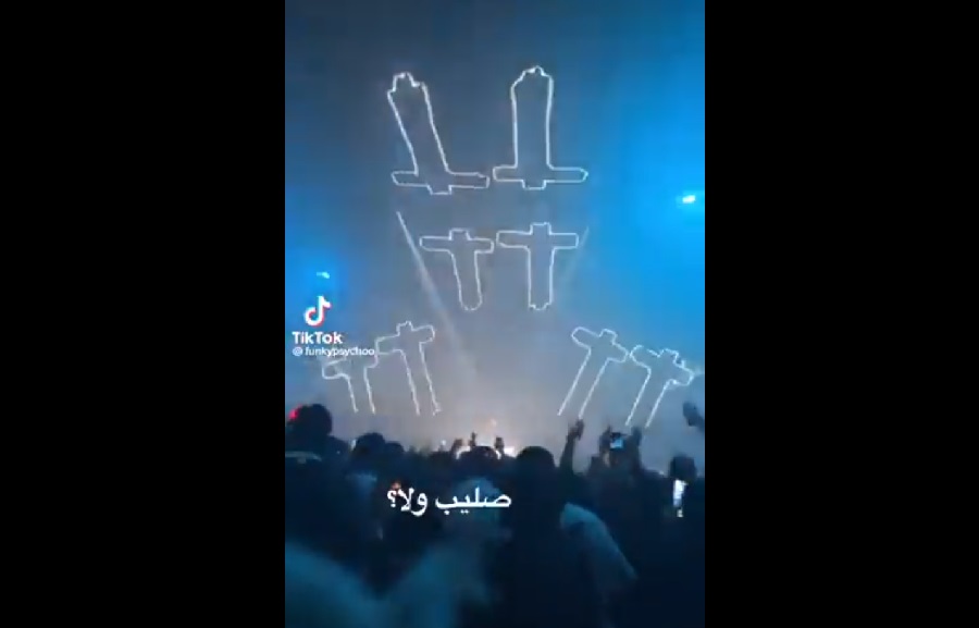 ويظهر مقطع فيديو متداول رسم صورة للصليب بالأضواء فوق المكان الذي أقيم فيه الحفل الغنائي الصاخب.