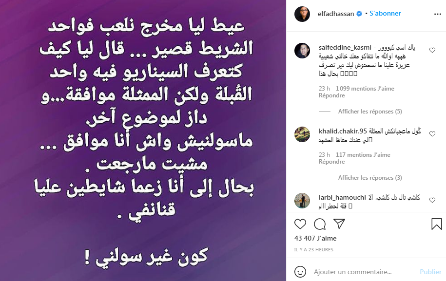 وعلى منصة نشر الصور والفيديوهات “أنستغرام” قال الفذ على حسابه الرسمي بها، ردا على طلب هذا المخرج  : ”عيط ليا مخرج نلعب فواحد الشريط قصير…قال ليا كيف كتعرف السيناريو فيه واحد القبلة ولكن الممثلة موافقة… داز لموضوع آخر”.