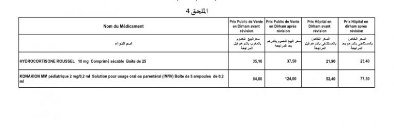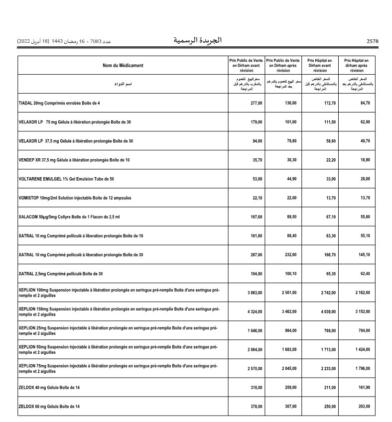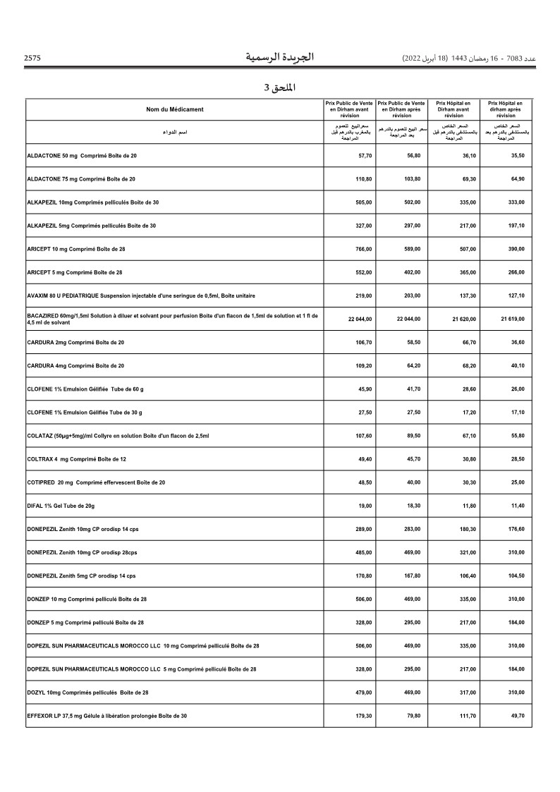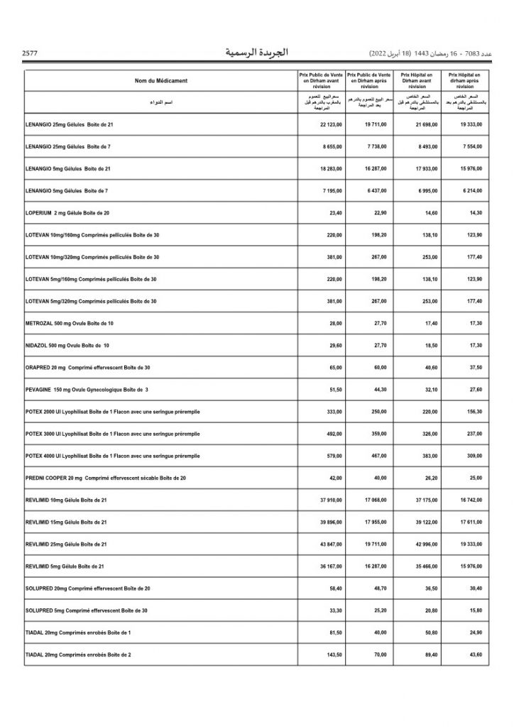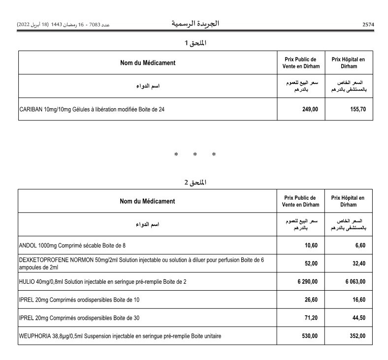 وتضمنت الجريدة الرسمية لشهر أبريل، قرار خالد آيت الطالب، وزير الصحة والحماية الاجتماعية، بمراجعة سعار البيع للعموم للأدوية الأصلية والجنيسة والمماثلة الحيوية المسوقة في المغرب، الذي عرف إلى جانب تخفيض 92 دواءً، تحديد سعر بيع دواء أصلي، والمصادقة على أسعار بيع 6 أدوية جنيسة ومماثلة حيوية للعموم والمستشفى، والرفع أيضا من ثمن اثنين من الأدوية (2).