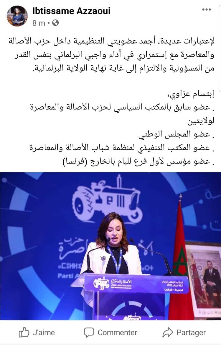 أعلنت النائبة البرلمانية عن حزب الأصالة والمعاصرة “إبتسام عزاوي” عن تجميد عضويتها التنظيمية داخل حزب الأصالة والمعاصرة لإعتبارات عديدة لم تفصح عنها. مضيفة أنها مستمرة في اداء واجبها البلماني بنفس القدر من المسؤولية والالتزام إلى غاية نهاية الولاية البرلمانية.