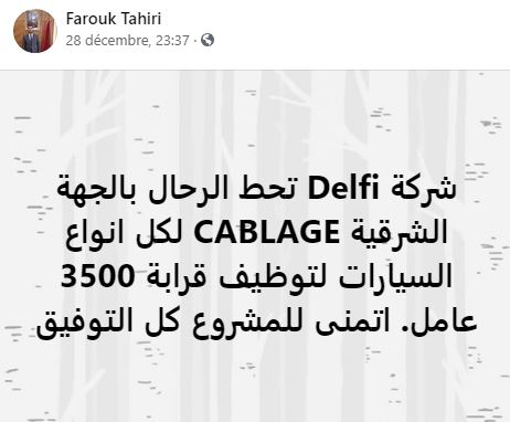 وحسب مصدر مسؤول في جهة الشرق، فإن الشركة الأمريكية “دلفي” (Delphi) التابعة للمجموعة العملاقة “جنرال موتورز” ستفتح رابع وحداتها في المملكة لصناعة أسلاك السيارات.