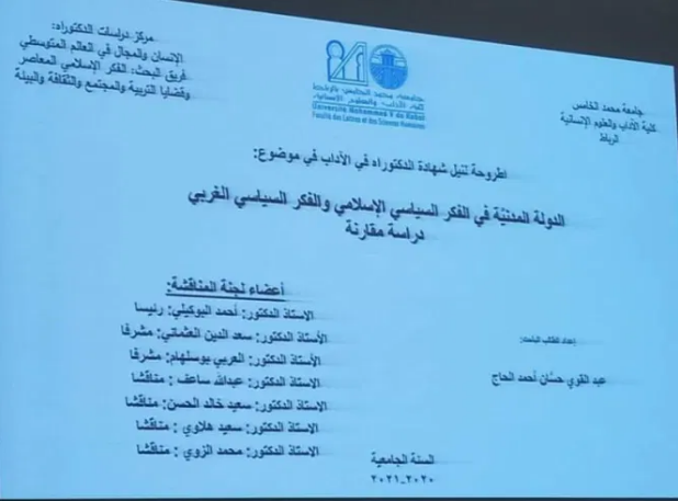 الدكتوراه التي أشرف عليها العثماني، رفقة الدكتور العربي بوسلهام، هي لطالب باحث يمني يدعى عبد القوي حسان أحمد الحاج، وجاءت تحت عنوان “الدولة المدنية في الفكر السياسي الإسلامي والفكر السياسي الغربي دراسة مقارنة”.