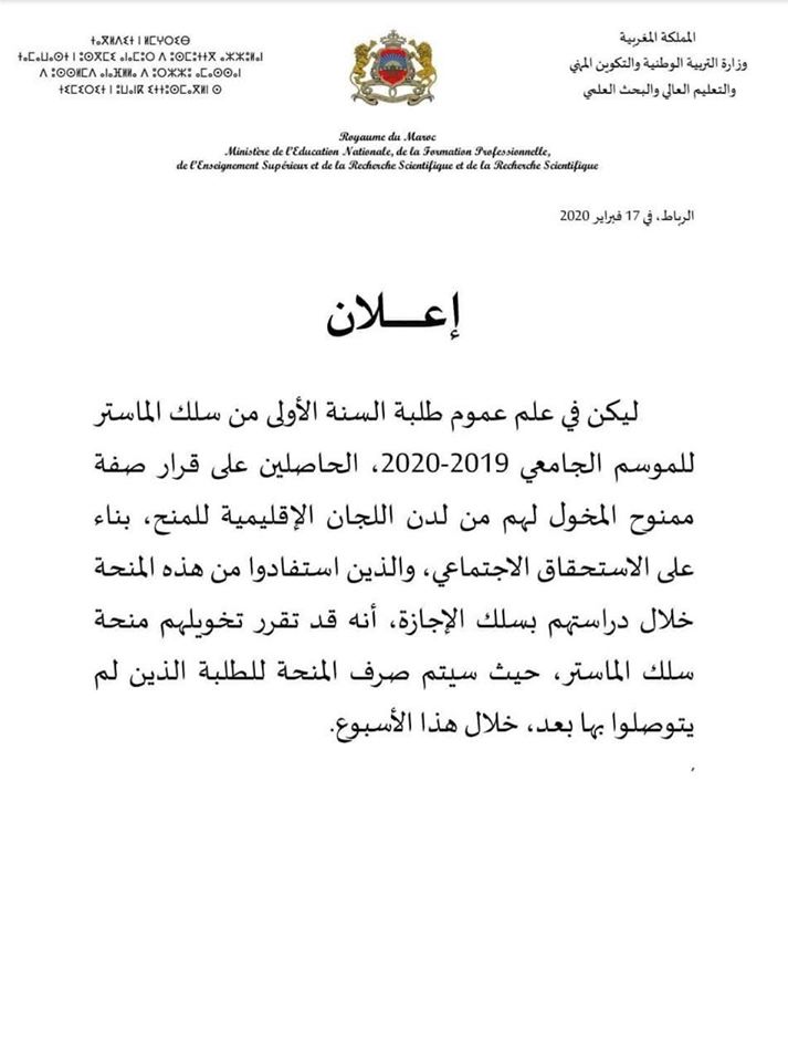 بعد موجة الغضب التي اجتاحت صفوف طلبة الماستر في العديد من كليات المغربية، وذلك بعد توصلهم بقرار حكومي يقضي بإلغاء تعميم المنحة الدراسية.