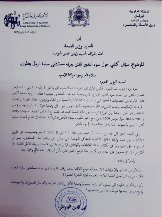 توجه فريق الأصالة والمعارضة بالبرلمان، بسؤال كتابي، إلى وزير الصحة خالد ايت الطالب، حول سوء التدبير الذي يعرفه مستشفىى “سانية الرمل” بمدينة تطوان، مطالبين بالكشف عن التدابير والإجراءات الاستعجالية المزمع اتخاذها بهدف وقف النزيف الذي يعرفه المستشفى، وتمكينه من وسائل العمل الطبية اللازمة وتعزيزه بالموارد البشرية المطلوبة.