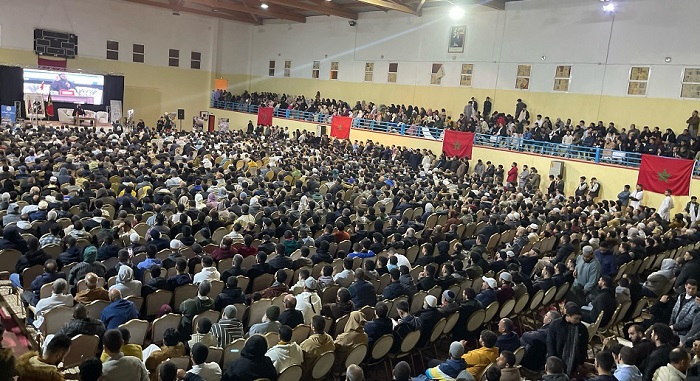 أمام حشد جماهيري كبير ألقى الأستاذ ياسين العمري ليلة السبت 08 مارس 2025 محاضرة في القاعة المغطاة بإيمزورن.